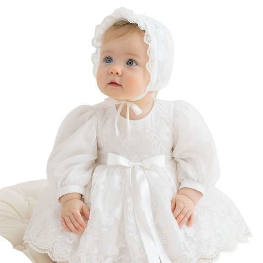 Elegant Lace Baby Christening Gown with Bonnet – Long Sleeve Baptism Blessing Dress
