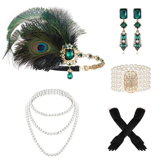 Green 1920s Gatsby Accessories Set – Peacock Feather Headband, Pearl Necklace, Gloves, Earrings, Bracelet