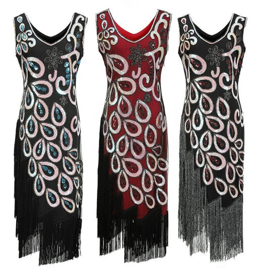 1920s Sequin Fringe Flapper Dress for Women – Peacock Beaded Vintage Gatsby Costume Dress for Roaring Twenties Party, Prom, Halloween