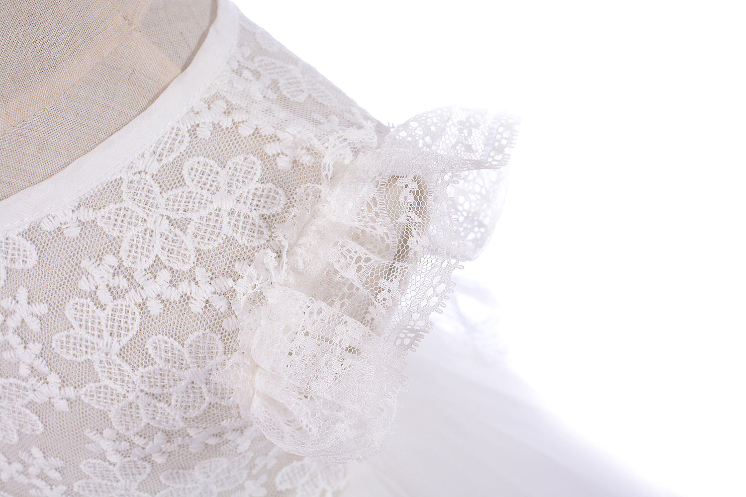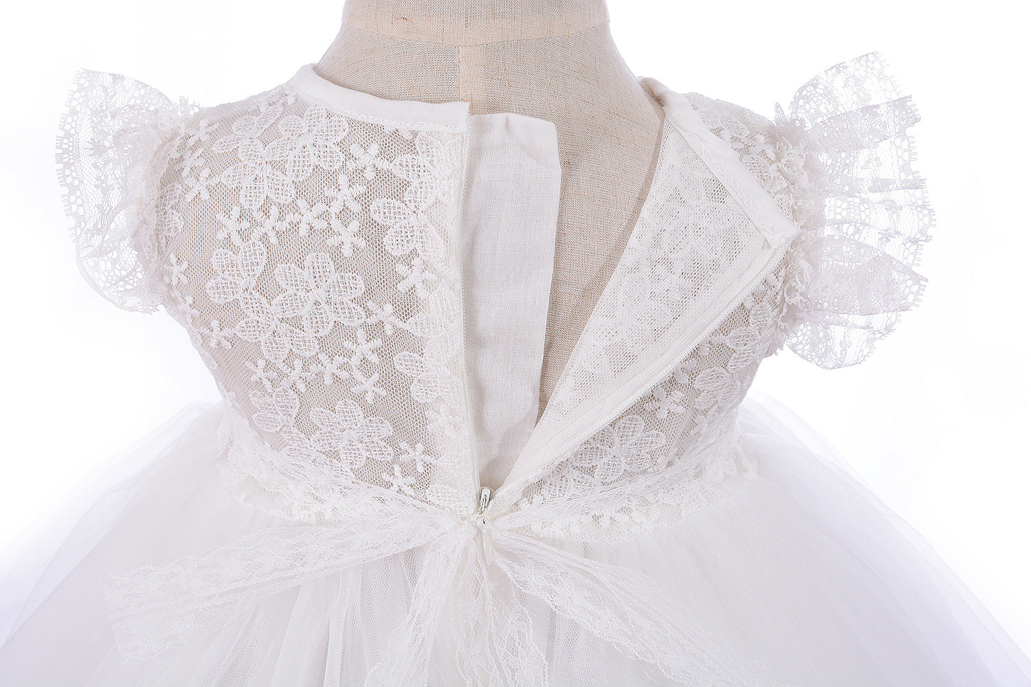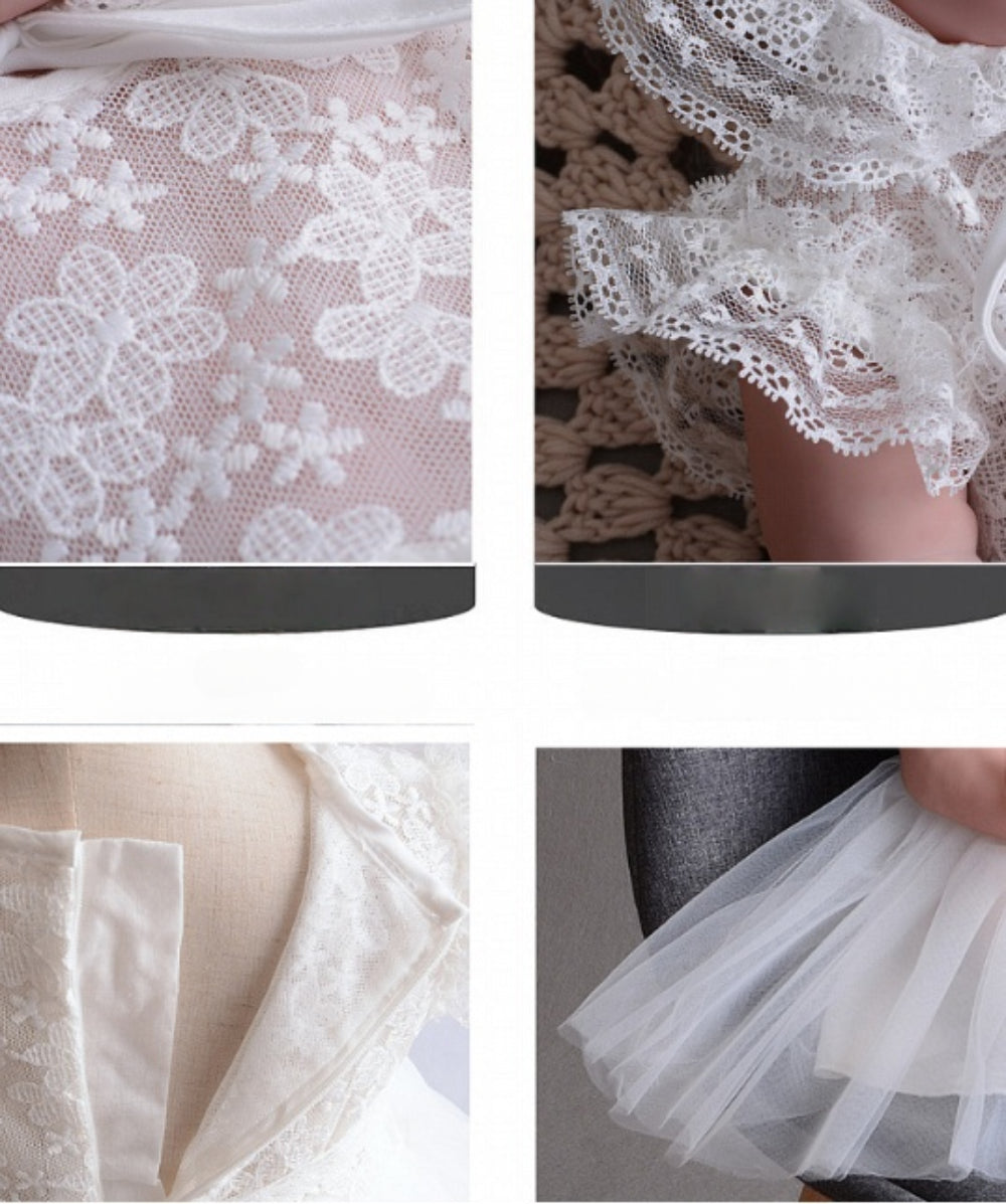 Designed for timeless charm and gentle comfort, this baby girl dress blends vintage elegance with modern practicality. The bodice features soft double-layer lace and mesh for a dreamy look, while the skirt flows with layers of delicate tulle and a full cotton lining to ensure breathability. Flutter sleeves and lace-trimmed details add a sweet, graceful touch. Complete with a matching bonnet and hidden back zipper, this outfit is ideal for christenings, birthdays, weddings, or any cherished celebration.