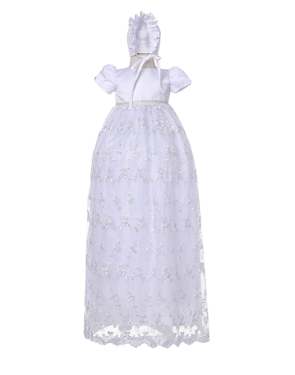 A matching lace bonnet completes the princess-worthy look — ideal for milestone celebrations, heirloom portraits, and timeless elegance.