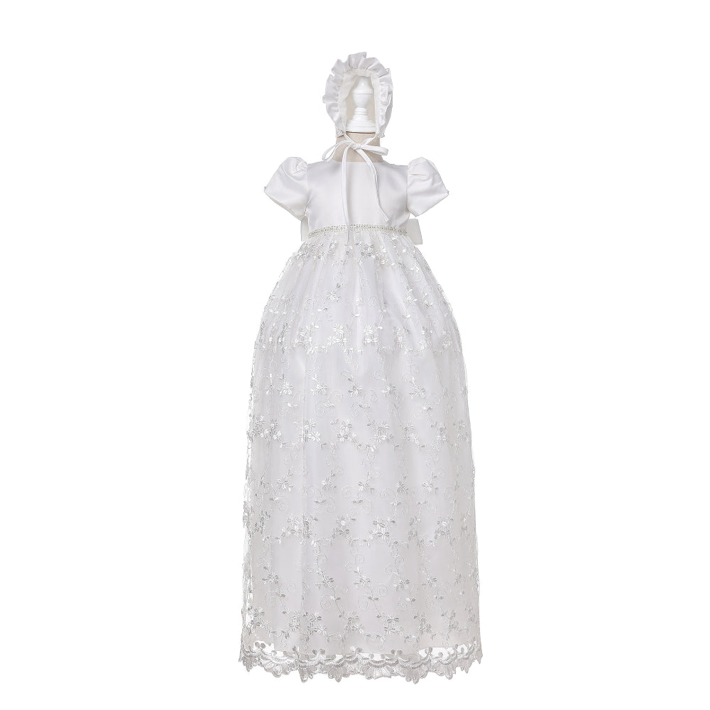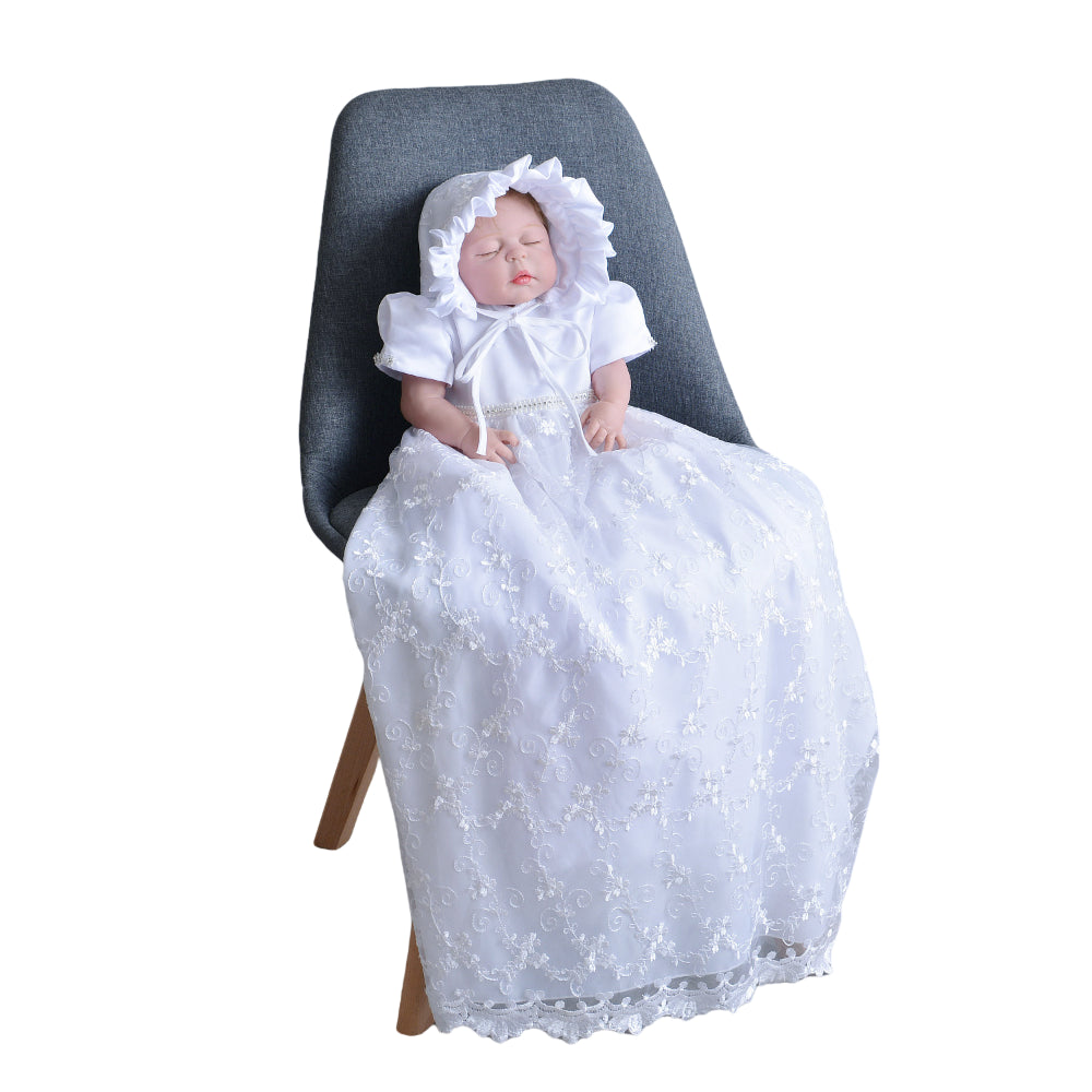 Long Lace Baby Girl Baptism Christening Dress Set – Ivory or White Princess Gown with Bonnet