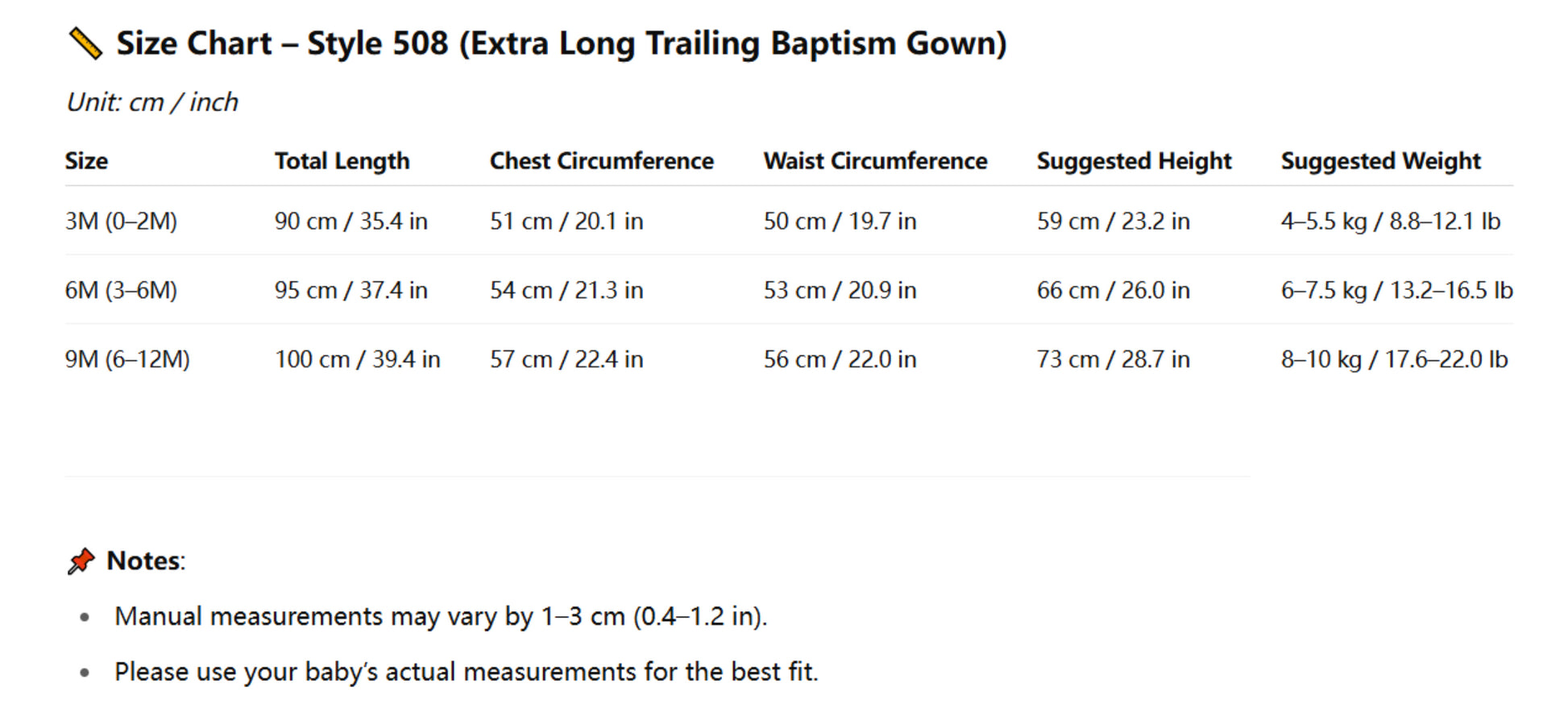 - Allow a 1–3 cm (0.4–1.2 in) difference due to manual measurement.