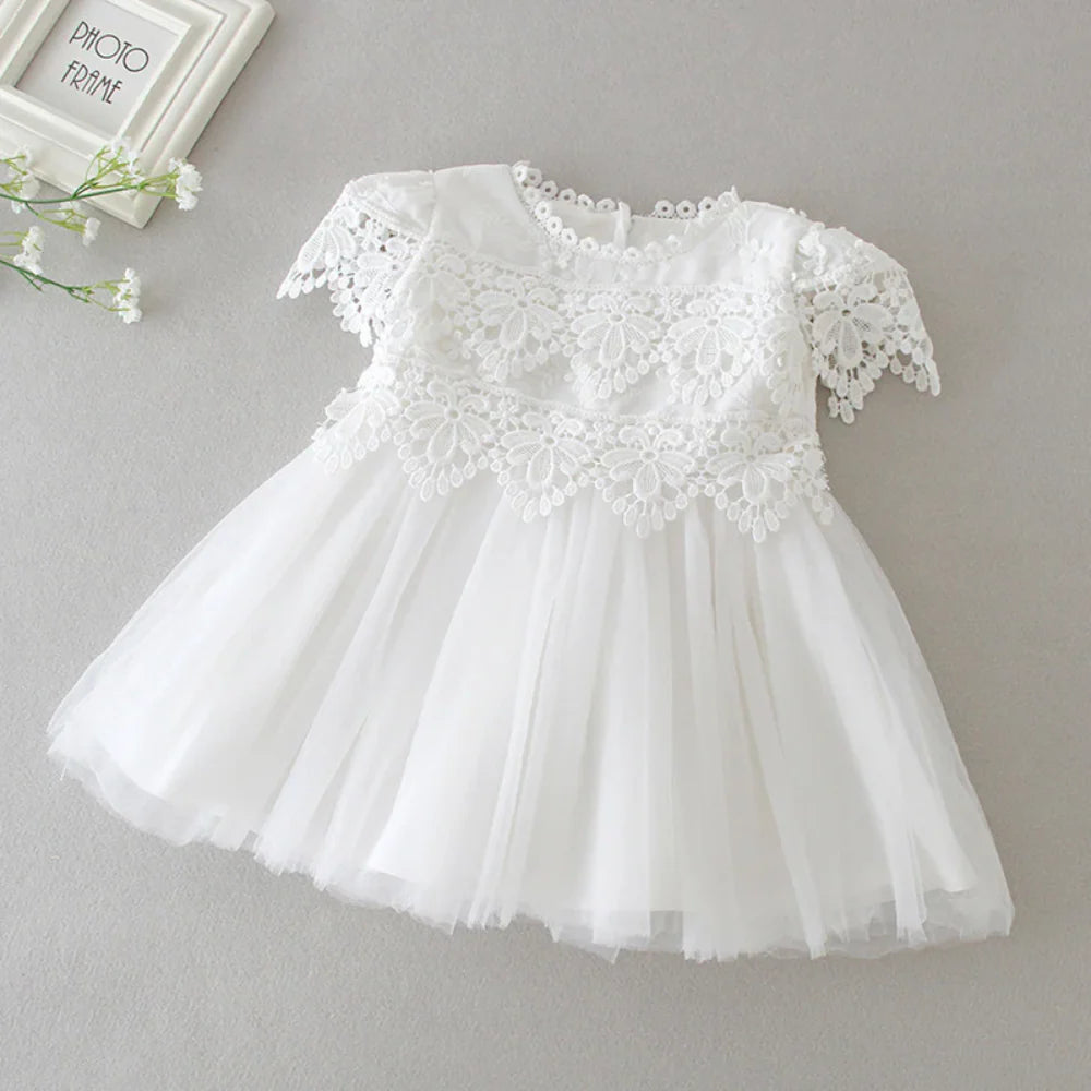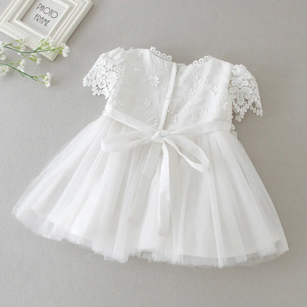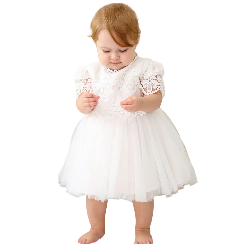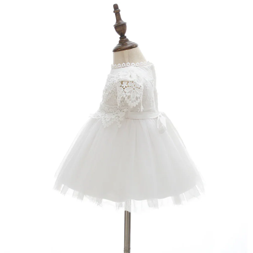 Highlights: Features a delicate lace high collar with charming puff sleeves. The bodice is double-layered — a soft cotton lining beneath intricate lace for comfort and elegance. The skirt is crafted from two layers of airy, lightweight tulle that flow gracefully. A waist sash adds a touch of sweetness, while the hidden back zipper ensures easy dressing and a seamless look. Gentle on baby’s skin and perfect for all-day wear. Can be beautifully paired with a matching bonnet for a complete outfit