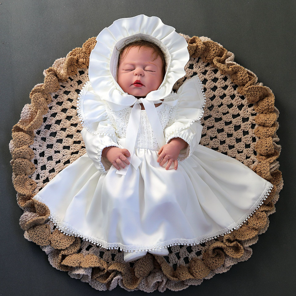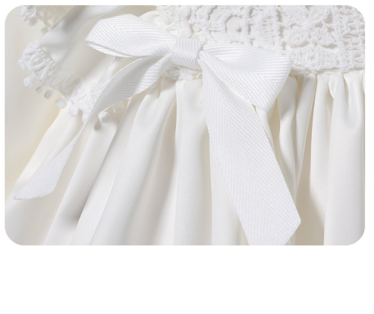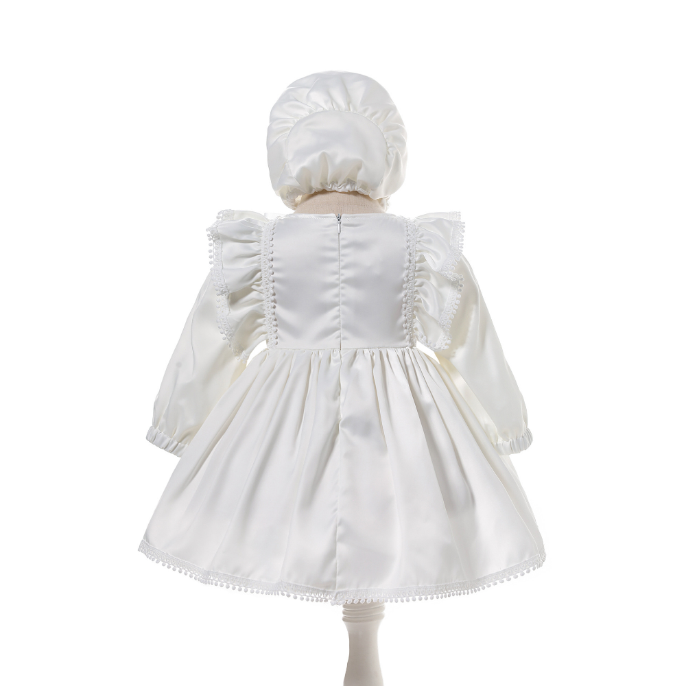 This elegant long-sleeve dress features a beautifully detailed lace overlay that adds timeless charm. Designed with a concealed back zipper and an adjustable waist tie to ensure a secure and flattering fit. The soft cotton lining provides all-day comfort, while elasticated cuffs allow ease of movement. Complete with a matching lace-trimmed bonnet, this outfit is both picture-perfect and gentle on delicate skin — ideal for your baby's special moments.