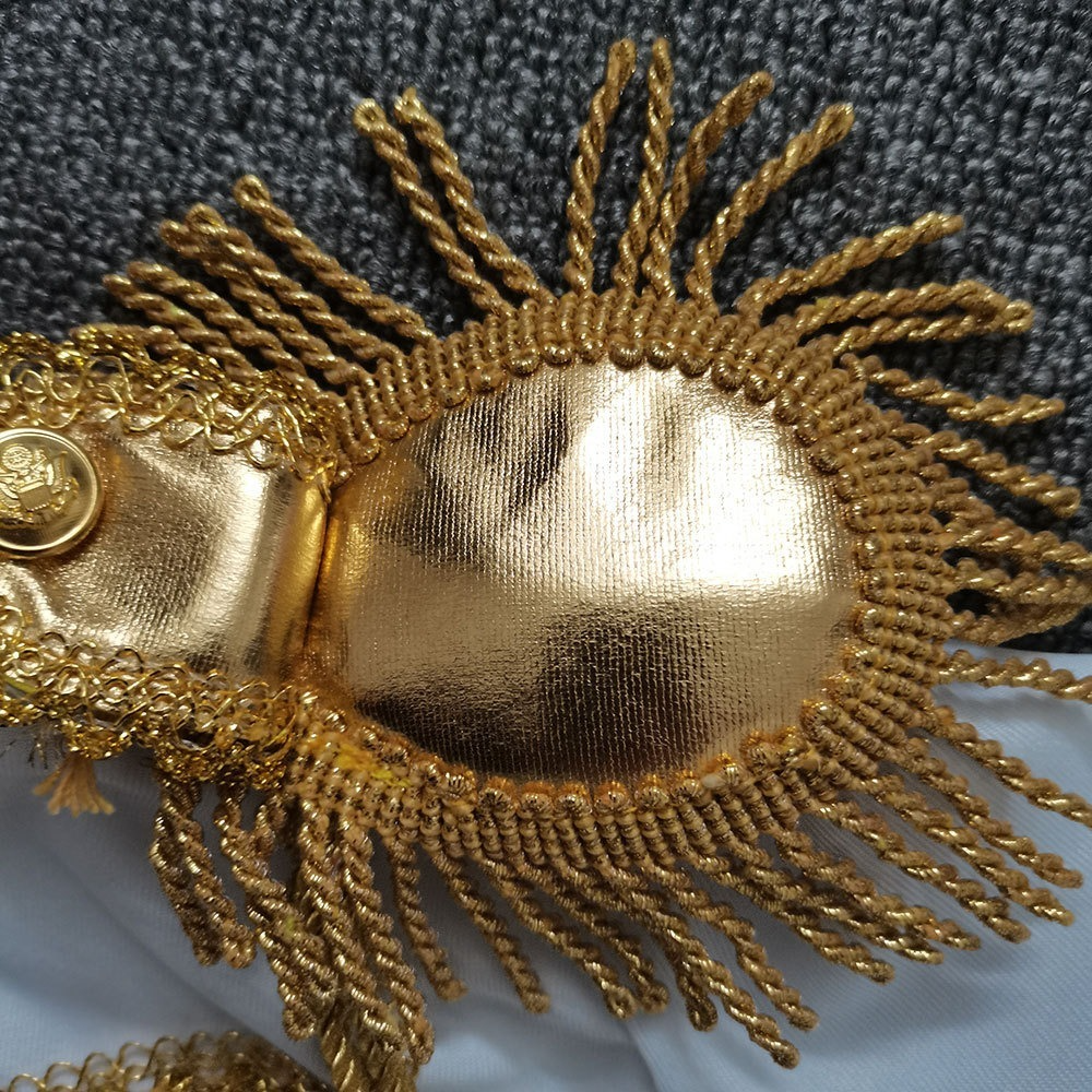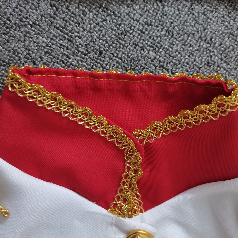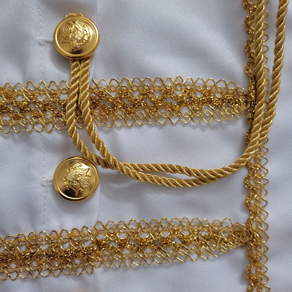 - The jacket has decorative buttons, shoulder pads and gold cords. The sides of the pants have gold stripes, a royal match looks like a handsome prince.