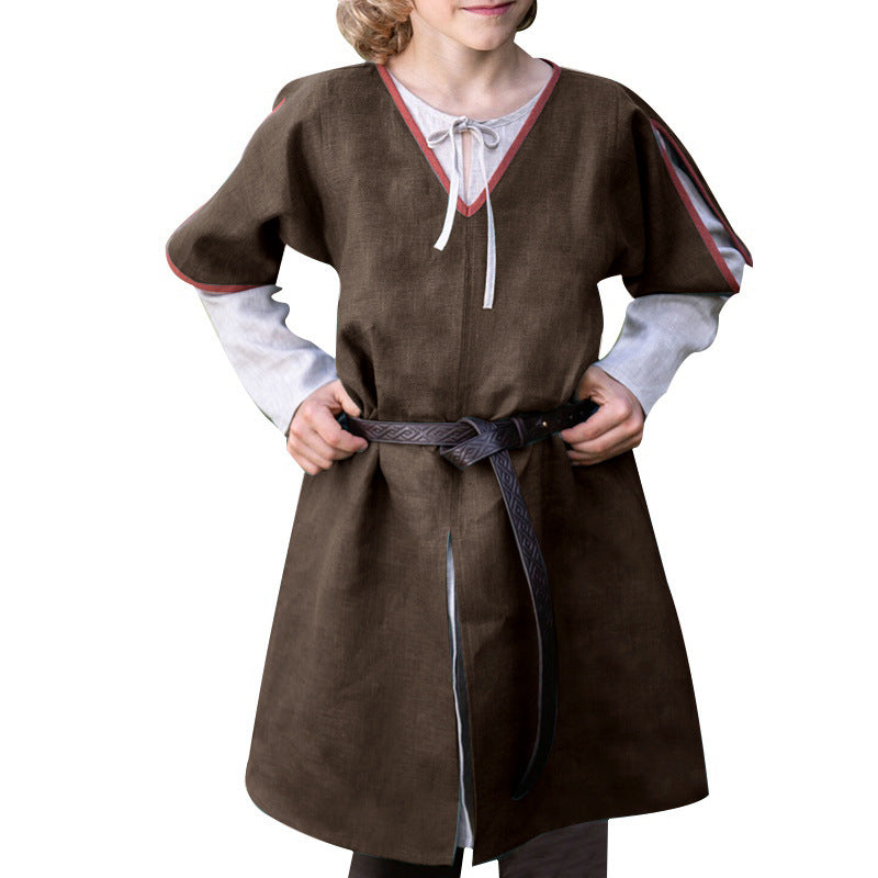 - Step back in time with our Children's Medieval Linen Tunic! Featuring a V-neck and short sleeves, this Viking warrior-inspired top is perfect for cosplay, reenactments, or themed events. Comfortable and durable, it's ideal for young adventurers. Order now and bring history to life!