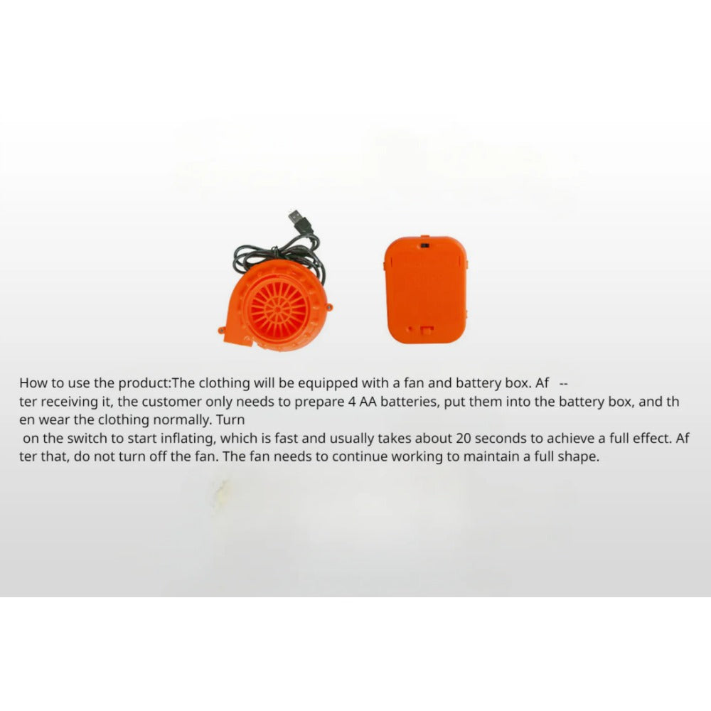 - How to use the product:The clothing will be equipped with a fan and battery box. After receiving it, the customer only needs to prepare 4 AA batteries, put them into the battery box, and then wear the clothing normally. Turn on the switch to start inflating, which is fast and usually takes about 20 seconds to achieve a full effect. After that, do not turn off the fan. The fan needs to continue working to maintain a full shape.