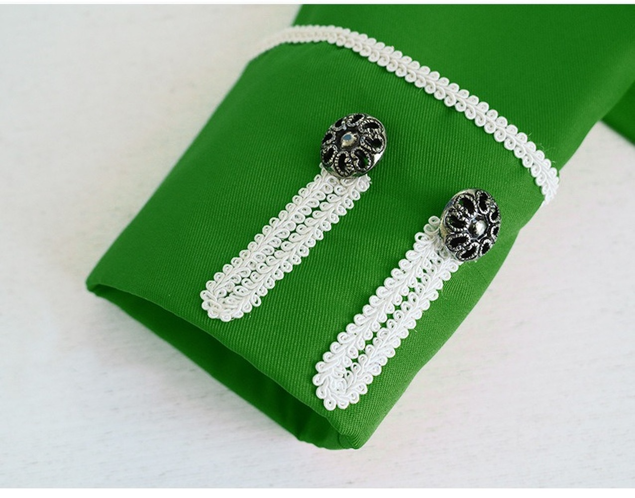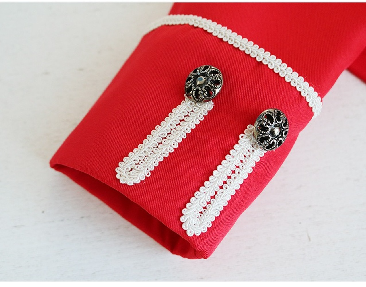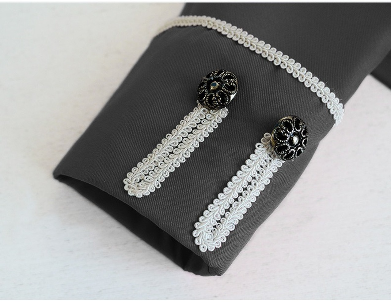 - Long sleeve, knee length coat, stand collar, vintage style.