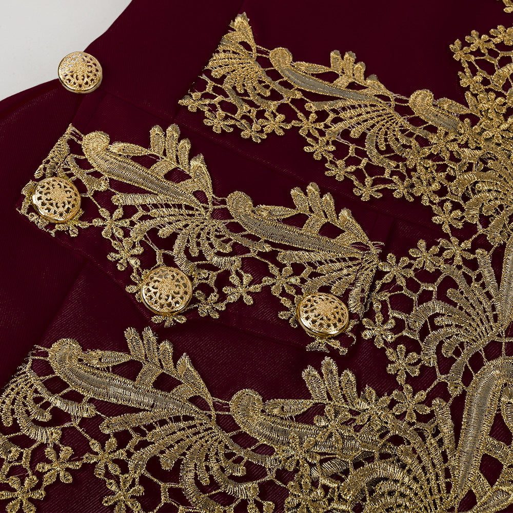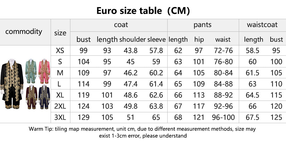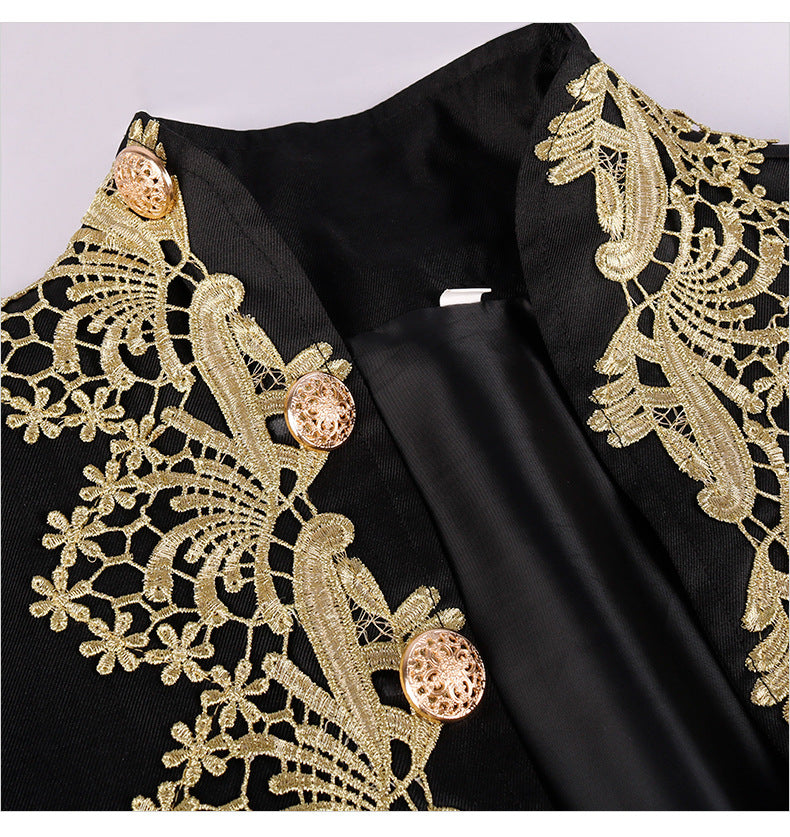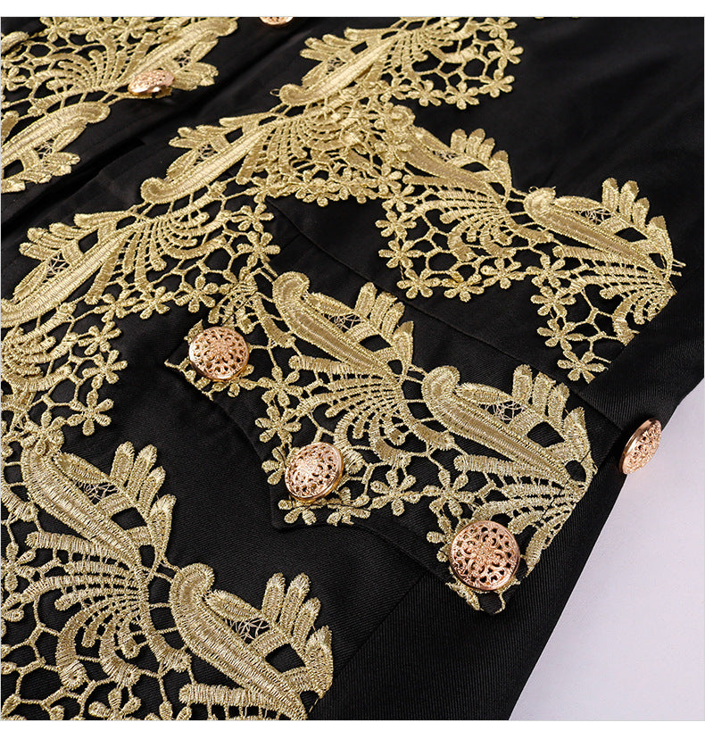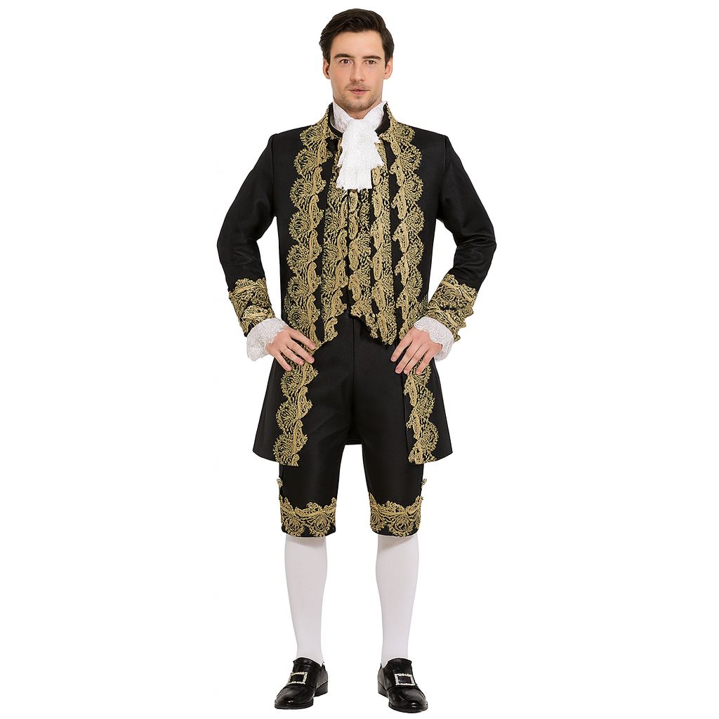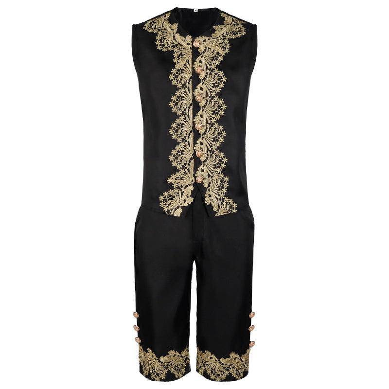 Bring elegance and nobility to your next event with this embroidered Prince Court costume. The retro black coat and coordinated pieces feature luxurious gold embroidery, perfect for stage performances, cosplay, Renaissance fairs, masquerade parties, and historical reenactments.