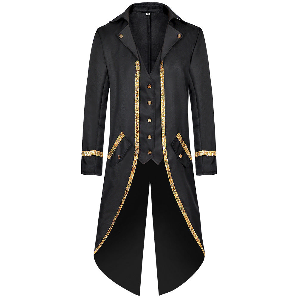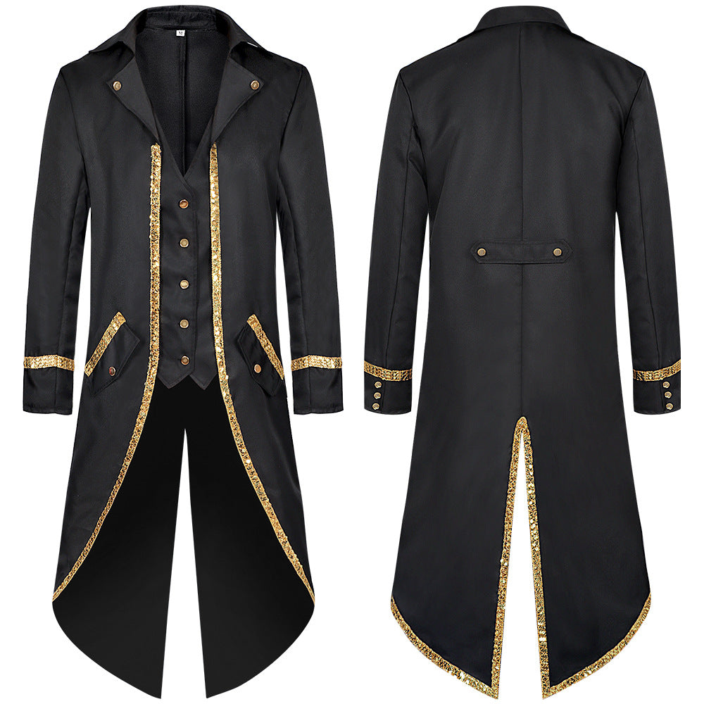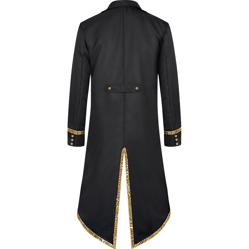 Elevate your wardrobe with this men’s vintage steampunk tailcoat—a bold blend of Gothic elegance and Victorian flair. Designed with shiny gold-edge trim, the retro tuxedo silhouette is ready for cosplay, themed parties, stage performances, and formal steampunk events.