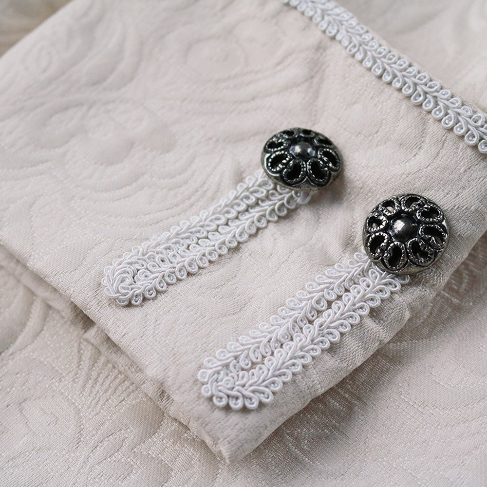 - Button closure · long sleeves · lapel collar · knee-length silhouette