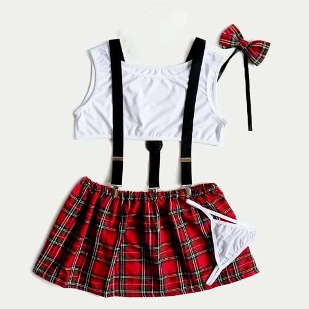 Adult uniform-inspired plaid lingerie set made from soft, stretchy fabric. Flexible fit (best for XS–L) with a sleeveless top, plaid midi skirt, suspenders and a cute bow tie—perfect for parties, clubwear, role play or intimate occasions.