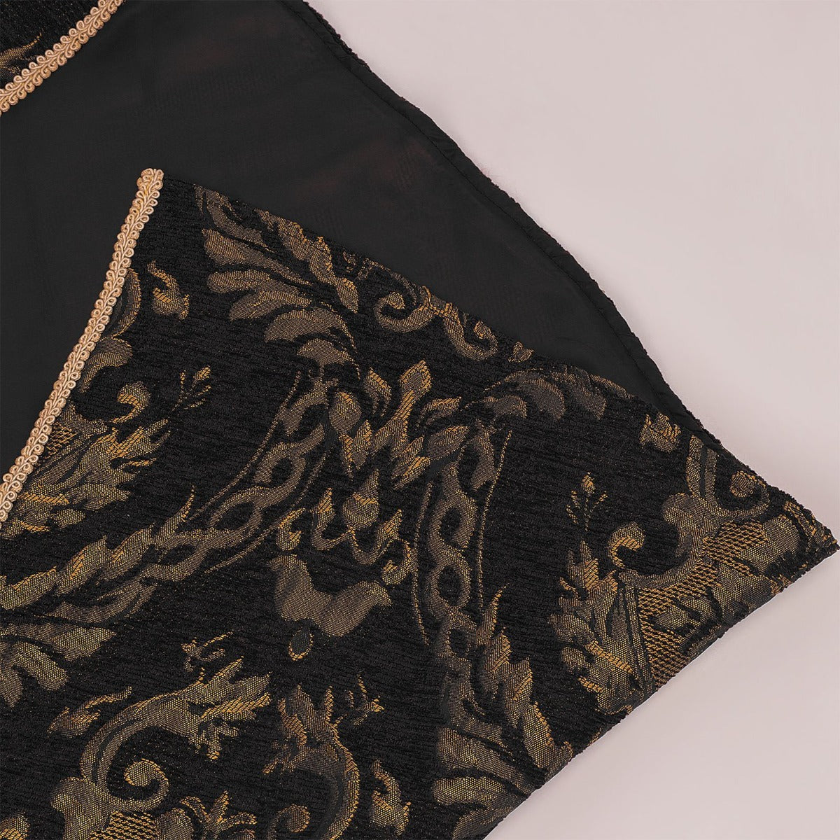 - Luxury jacquard fabric — richly textured patterns with gold-tone detailing
