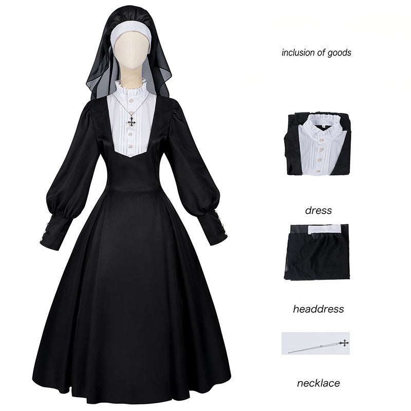 Elevate your Halloween or cosplay look with this women’s priest/sister costume. The retro-inspired dress features a stand-up vibe with coordinated accessories for an instantly polished, character-ready outfit—perfect for parties, stage performances, LARP and themed events.